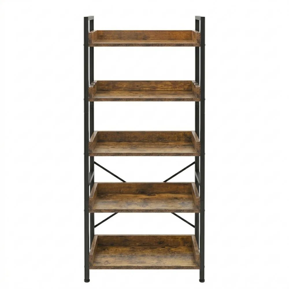 Montage und Pflege sind unkompliziert mit klaren Anweisungen und nummerierten Teilen. Die Oberfläche ist leicht mit einem feuchten Tuch zu reinigen. Spezieller Kantenschutz hält Gegenstände wie Bilderrahmen und Figuren sicher. Inklusive 4 Haken zum Aufhängen von Kopfhörern oder Dekorationen. Mit Anti-Kipp-Gurten für zusätzliche Sicherheit. X-förmige Stangen auf der Rückseite und verstellbare Füße sorgen für Stabilität und verhindern Kratzer. Mit den Maßen 64 x 30 x 160 cm (L*B*H) bietet das 5-stöckige Regal Platz für Bücher, Dekorationen oder Küchenutensilien. Rustikales Holz kombiniert mit schwarzem Metallrahmen verleiht dem Raum industriellen Charme.