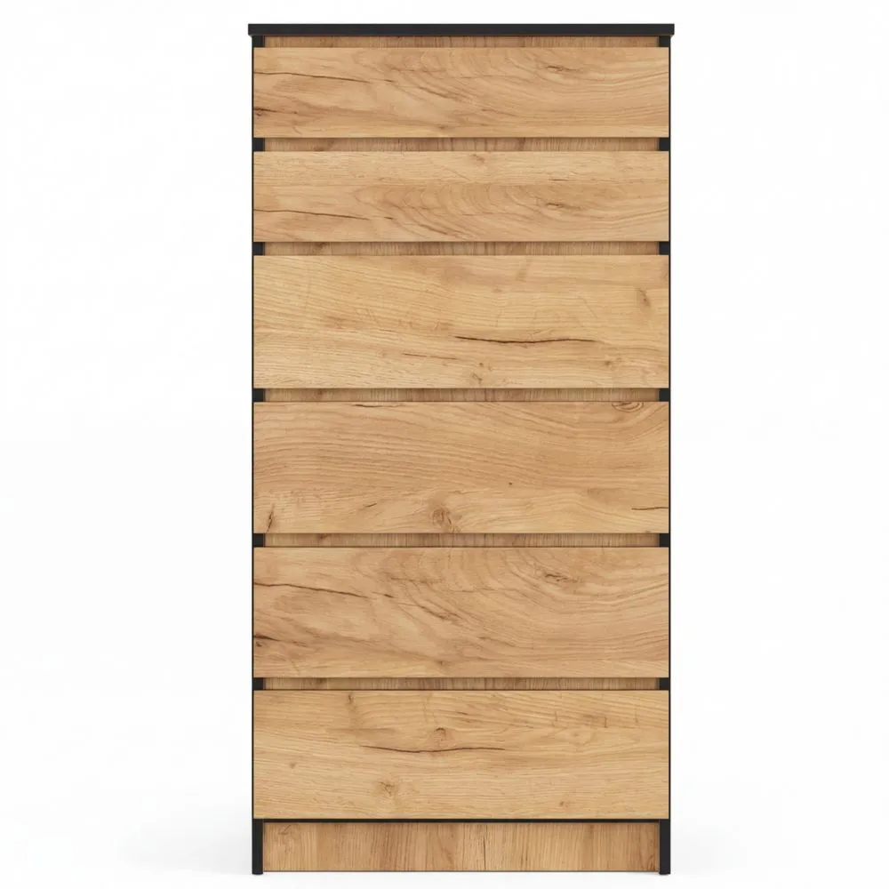 Diese Kommode mit 6 Schubladen bietet praktische Ablagefläche und zusätzlichen Stauraum für verschiedene Gegenstände. Hergestellt aus laminierten Möbelplatten, sind die Kanten mit abriebfestem ABS-Kunststoff versehen. Die Schubladen sind grifflos und mit leichtgängigen Metallschienen ausgestattet. Die Oberfläche ist wasser- und fleckenresistent und somit pflegeleicht zu reinigen. Mit ihrer kompakten Größe ist die Kommode für verschiedene Räume wie Schlafzimmer, Kinderzimmer oder Büroräume geeignet. Dank der soliden Bauweise und den hochwertigen Materialien bleibt die Struktur stabil und langlebig.